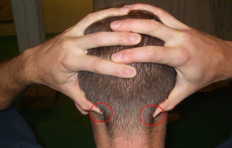 Chúng ta có thể Sử dụng ngón tay cái để day ấn vào các góc của hộp sọ,chỗ điểm G20. Nhắm mắt lại khi nghiêng đầu từ từ, hít thở sâu và chậm khi giữ trong 2-3 phút, hướng áp lực từ từ và chắc chắn.